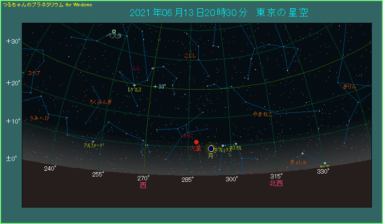 20時半ごろ、西北西の低い位置をご覧ください。月齢3.0の三日月が見えます。火星は1.8等で、火星としては暗くなっています。月の左側にあり、間隔は5.7度と広い目です。最も近づくのは翌日の早朝で、8時間ほどズレています。このため今回は、間隔が広くなっているのです。