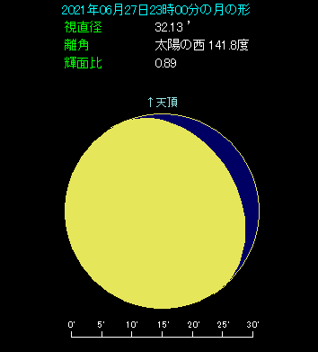 6月27日の遅い時間、月が土星に近づきます。 下の星図は23時ごろ、南東の空を見たようすです。月と土星が縦に並んでいます。月齢は17.1で、満月から3日近くたっています。土星との間隔は5.2度と少し開いています。