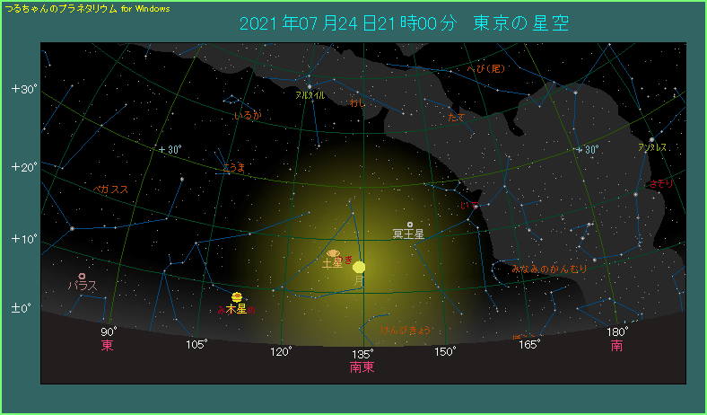 7月24日は月が土星に近づきます。 21時ごろ、南東の空をご覧ください。比較的低い位置に月が見え、今日が満月です。土星はその左からやや上側です。間隔は5.6度と、いまひとつ冴えない接近です。最も接近するのは翌日の5時台で4.1度まで近づきますから、この後時間がたつほど間隔が狭くなります。