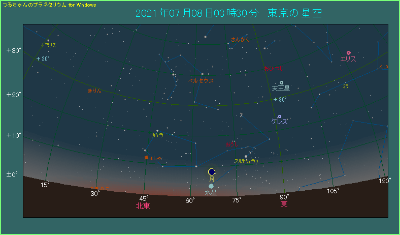 空が明るくなり始めるのは2時45分ですから、薄明開始から45分たっています。また、1時間ほど後の4時32分に日の出を控えていますから、モタモタしている余裕はありません。できれば双眼鏡も使いながら、早いうちに見つけたいところです。