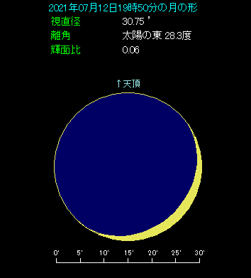 下の星図は7月12日の19時50分ごろ、西の方角を眺めたようすです。最も高度が低いのは金星で、8.6度です。火星は金星とほぼ同じ高度で、横に並んでいます。両者の間隔は0.8度と大接近状態で、ここへ月齢2.4の細い月が近づきます。月と金星の間隔は2.5度、月と火星の間隔は3.2度となっています。狭い範囲に3つの天体が集まるのは見ものです。