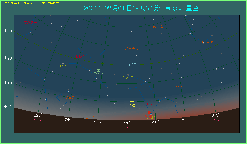 上の星図は日の入りから45分がたった西空のようすです。空が完全に暗くなるのは54分後ですが、金星の高度は10度ほどしかありません。この後金星は、1時間もたたない54分後に沈んでしまいます。