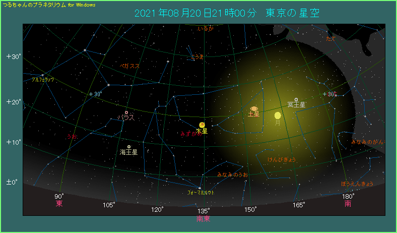 夜の21時ごろですと、木星は南東の空に見えます。星座でいうとやぎ座ですが、ほとんどみずがめ座との境界線上です。相変わらず南半球にありますので、南中高度が低くて大気の影響を受けやすいですが、昨年や一昨年あたりに比べると、少しマシです。気流が落ち着いた日なら、小型の天体望遠鏡でも縞模様や大赤斑が見えて、木星らしさを十分楽しめるでしょう。