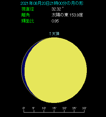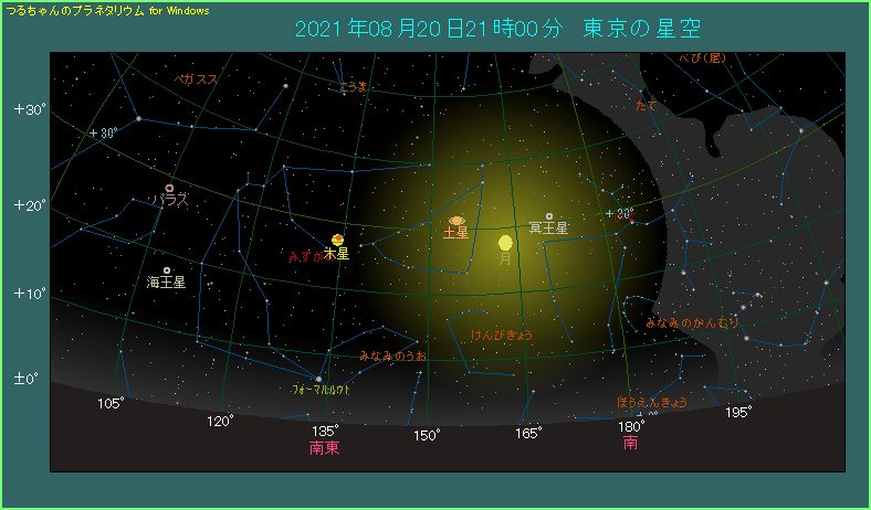 21時ごろ、南南東の方角をご覧ください。月齢11.9という丸みを帯びた大きな月があります。月の右側には今月2日に衝を迎えたばかりの土星があります。明るさは0等級と明るいですから、満月に近い月明りがあっても、肉眼で確認することができます。間隔は8.1度も開いていますので、接近と呼べるようなものではありません。