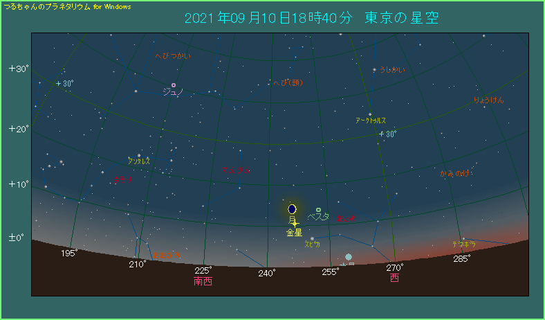 二つの天体の間隔は3.5度と、まずまず条件の良い接近です。しかし、金星の高度は10.7度しかなく、19時39分に沈んでしまいます。もたもたしていると、すぐに高度が低くなってしまいますから、早いうちに見られた方が良いでしょう。