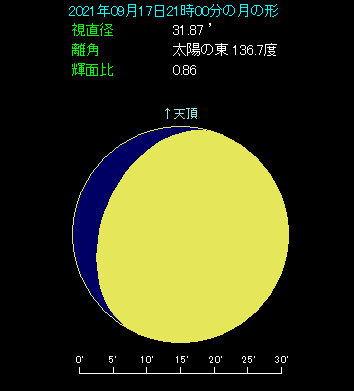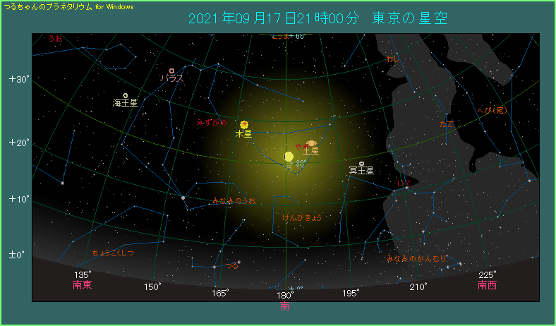 9月17日は月が土星に近づきます。 近づくといっても、6.2度も間隔が開いていますから、接近している感じはありません。下の星図は21時ごろの場合です。月齢10.5の丸みを帯びた月が真南にあります。土星は右上方向にあり、0等級で黄土色に光ります。