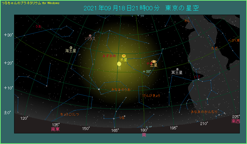 昨日に続いて、今日は月が木星に近づきます。 21時ごろに南の方角をご覧ください。月齢11.5という満月3日前の月があります。木星は月の右上にあり、4.8度の間隔で斜めに並びます。東京で両天体が最も近づくのは16時台で、その時の間隔は4.6度です。