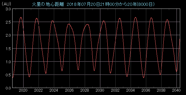 9月20日の地球と火星の距離は、2019年に32年ぶりの最遠となった2.6753AUにはおよびませんが、それでも2.6381AUまで遠ざかります。