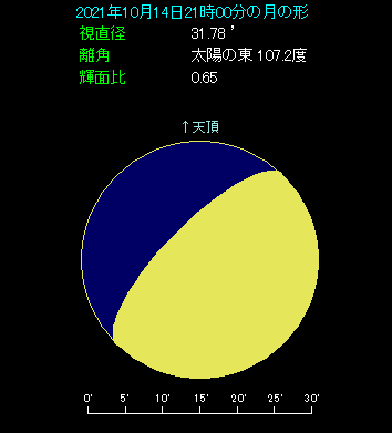 10月14日は月と土星が斜めに並びます。 21時ごろ、南西の空をご覧ください。月齢8.0で上弦の翌日という、少し丸みを帯びた月が見えます。土星は月の右上にあって0.5等で光り、4.7度の間隔で並んでいます。