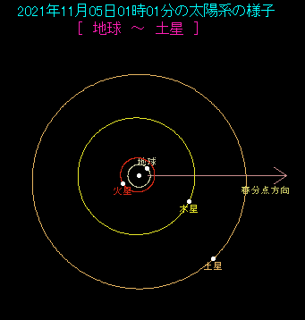 東矩とは、惑星が太陽の東側へ90度離れて見えることです。下の太陽系の図では太陽、地球、土星を結ぶ線のなす角が90度になっています。東矩になった惑星は、夕方頃に南中します。
