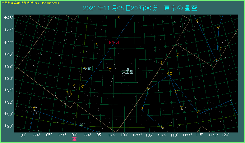 天王星は今、おひつじ座にあります。20時ごろですと、東の方角に見えます。おひつじ座の2等星ハマルを目印に、下の方へたどりましょう。天王星の明るさは5.6等です。肉眼で見つけるのは難しいですから、少なくとも双眼鏡を用意しましょう。