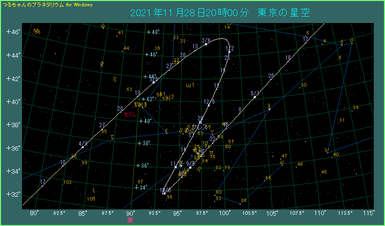 ケレスはおうし座の中で後ずさりするような動きを見せます。11月28日の位置はヒアデス星団に近いですから、他の星と見間違えそうです。そんな時は数日たってから観察しましょう。ケレスなら移動していますから、もし移動が確認できたらケレスに間違いありません。