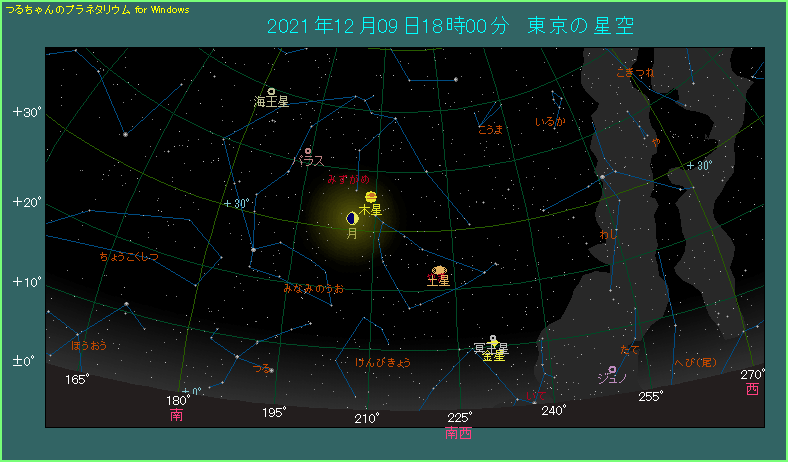 12月9日は月と木星がななめに並びます。 昨日は月が土星に近づきましたが、今日は木星の近くに移動しました。月と木星の間隔は4.9度ですから、それほど条件が良いわけではありません。月齢5.1の月と -2.3等の木星がななめに並んだ様子は、夕空で目につくでしょう。