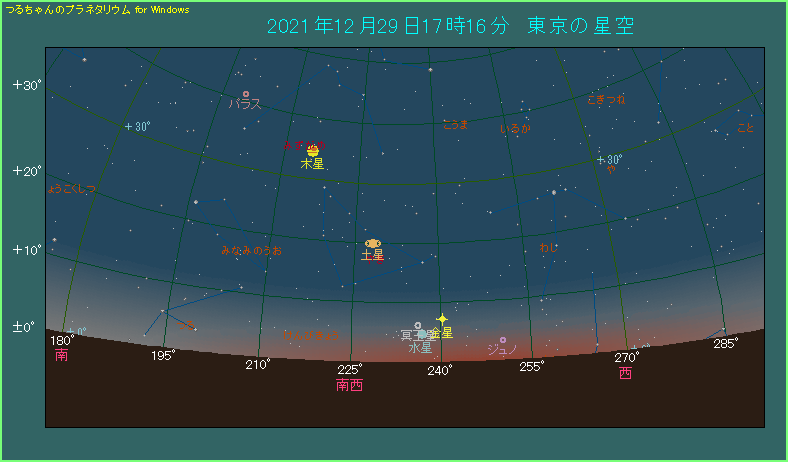 暮れも押し迫った12月29日の夕方、水星と金星が並びます。 星図は東京で日の入りから40分が経過した頃、南西の低空のようすです。金星の高度は7.1度です。一方の水星は金星の左下へ4.2度離れています。-0.7等の明るさですが、高度は4.8度しかありません。