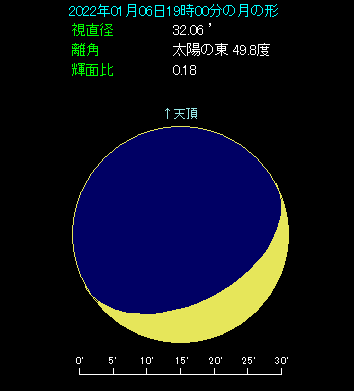 1月6日は月と木星が近づきます。 19時ごろ、南西の方角をご覧ください。やや低い位置に月齢3.6の三日月が見え、下方向からやや右寄りが光っています。月の右側に金色で光る明るい星があり、木星です。間隔は少し開いており、5.5度あります。