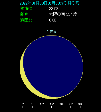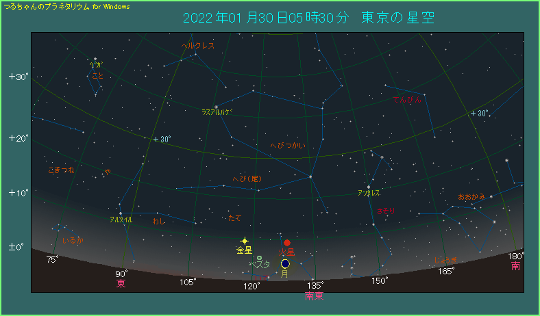 月は火星の下へ5.1度離れたところにあります。月齢27.1で新月の2日前という細い月で、高度は4.1度しかありません。とても細くて光り方は弱々しいですから、条件が整わないと見つけるのに苦労するかもしれません。