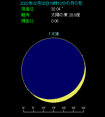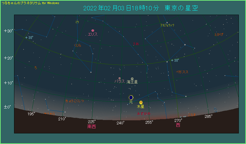 まず、-2.1等で輝く木星が目に付きます。木星の左側からやや上方向に、月齢2.2の細い月があります。間隔は6.1度と開き気味です。19時1分に木星が沈んでしまいますから、早い目に見ておきましょう。