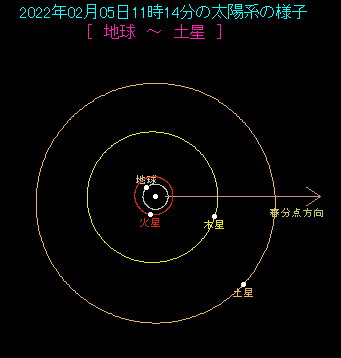 2月5日は土星が合となり、太陽と同じ方向へやってきます。 太陽系の図を見ると、地球、太陽、土星がこの順で一直線に並んでいます。地球から見た土星が太陽の方向に見えることがわかるでしょう。当然ですが、土星は太陽の強烈な光に邪魔をされて、観測することができません。