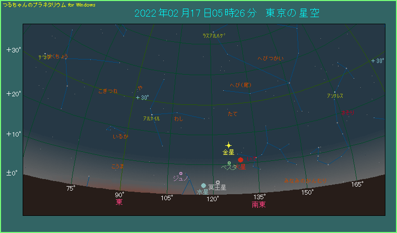 下の星図は東京で日の出から1時間前に南東の方角を眺めたようすです。暗夜が終わって空が明るくなり始めるのは5時01分ですから、既に空が白み始めています。