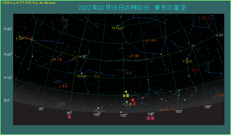 上の星図は東京で朝5時ごろに見える金星の位置です。東京ではちょうど5時に暗夜が終わりますので、これ以降は薄明が始まります。