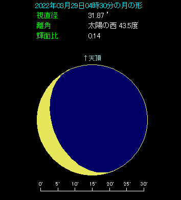 ところで、4天体の中で最も間隔が開いているのは、月と火星の9.6度です。昨日は月と金星が11.8度開いていましたから、今日の方が昨日よりもまとまっており、10度以内に4天体が集まった格好です。3惑星なら28日が最も間隔が狭く、月を含めた4天体なら29日がベストです。