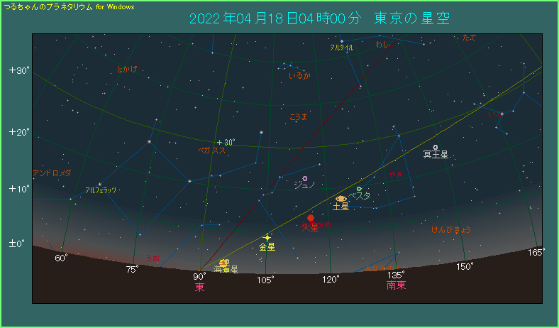 東京では3時35分から薄明が始まっています。5時5分に日の出を控えており、空は明るくなってきています。空の条件が悪いと、0.9等の火星と0.8等の土星は、見づらい可能性もあります。空が明るくなる前に、できるだけ早く見終えるようにしましょう。東から南東の方角が開けた場所でご覧になるのもお忘れなく。