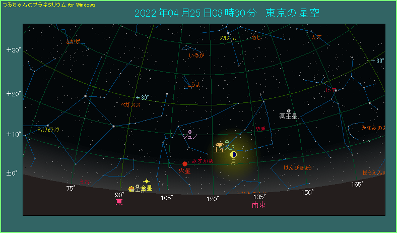 ところで、月と土星はやぎ座にあります。やぎ座といえば秋の星座のトップバッターですが、春でも早朝なら見ることができるんですね。暗い星が多くて探しづらいですが、この時間帯は街明かりが少なくて見やすいですから、ついでに星座探しもいかがでしょうか。
