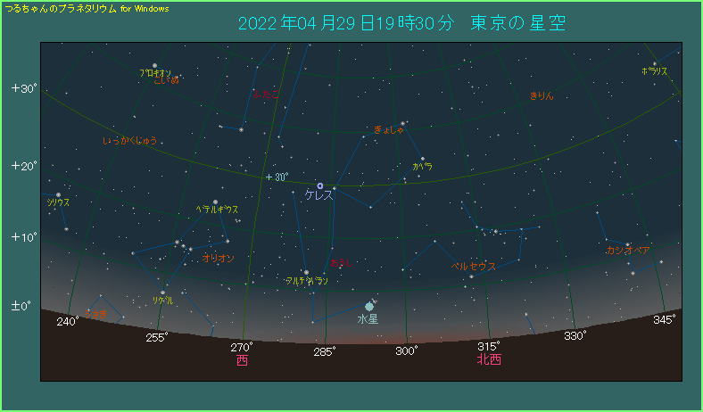 星図をご覧ください。19時半ごろに東京から見た西北西の様子です。18時26分の日の入りから1時間たっており、薄明がだいぶ和らいでいます。水星の高さも7度ちょうどで、そこそこあります。空が完全に暗くなるのは20時ちょうどですが、この時の高度は1.5度しかありませんから、実際に肉眼で観測するのは難しいでしょう。空がそこそこ暗くなり、しかも水星の高度もそこそこある時間帯が狙い目なのです。