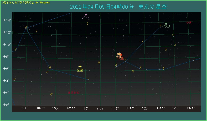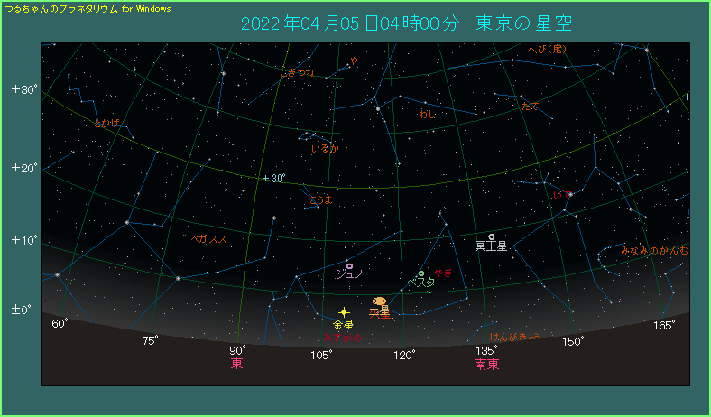 火星と土星の間隔は前日なら0.9度、翌日なら0.6度と、こちらも大接近状態です。4月5日に見られない方もあきらめずにご覧ください。金星もいっしょに、とてもにぎやかな東天を楽しみましょう!