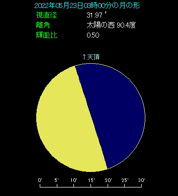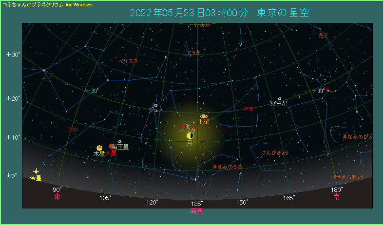 5月23日は月が土星に近づきます。 早朝3時ごろ、南東の空をご覧ください。今日が下弦という半月が見えます。土星は月の右上です。しかし、間隔が8.1度も開いており、接近と呼べるようなものではありません。近づくという表現すら怪しいくらいです。