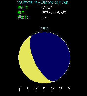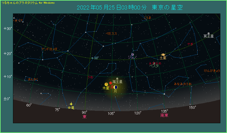 早朝3時ごろ、東の方角をご覧ください。まず目に入るのは月齢23.9という三日月よりも太った月です。左上に火星と木星があるのですが、月に近いのは火星です。間隔は3.7度と、まずまず近い位置にあります。一方、月と木星の間隔は5.7度と少し開き気味です。