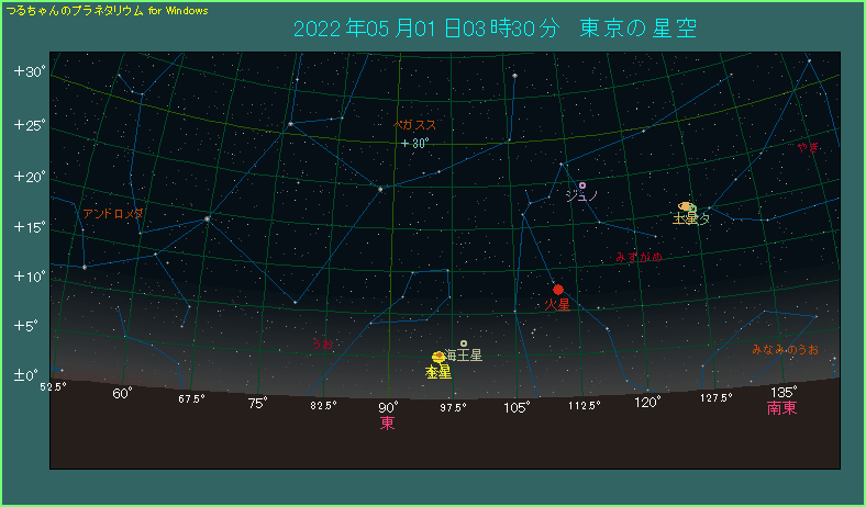 金星は4月28日に海王星との超大接近を果たしたばかりですが、今度は木星と0.2度ちょっとまで近づきます。下の星図は5月1日の3時30分ごろ、東の低空を眺めたようすです。いつもより少し拡大しましたが、それでも金星と木星がほとんど重なって表示されています。