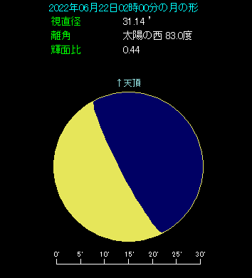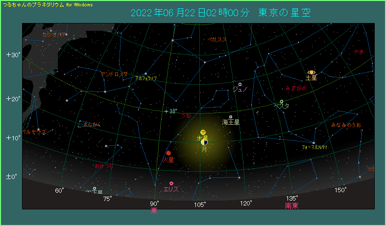 6月22日は月と木星が縦に並びます。 深夜の2時ごろ、東の方角をご覧ください。昨日が下弦だった月齢22.2の月が見えます。一方の木星は3.4度上方に離れた位置にあり、縦に並んだ格好です。