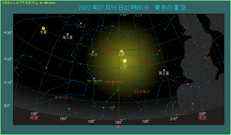 7月16日の未明、月と土星が近づきます。 深夜の2時ごろ、南の空をご覧ください。月と土星が縦に並んでいるのがわかります。月齢は16.6で、2日前がスーパームーンの満月でした。土星は5.9度離れており、だいぶ間延びした感があります。
