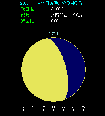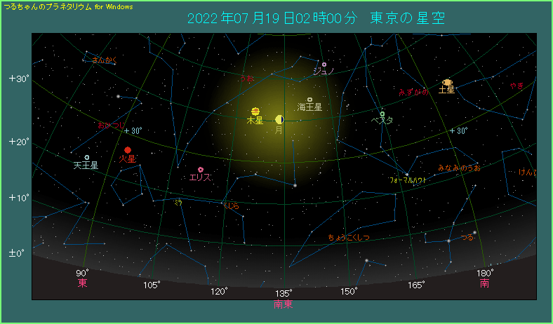 深夜の2時ごろ、南東の方角をご覧ください。翌日が下弦という月齢19.6の月があります。木星は月の左側で、横に並んだ格好です。