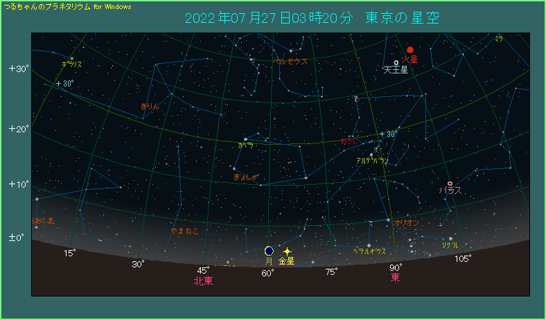 7月27日の未明、月と金星が並びます。 東北東のごく低空をご覧ください。-3.9等の金星が高度3.8度という低い位置に見えます。月は金星の左側です。月齢は27.8で2日後が新月という非常に細い月です。間隔は4.6度とまずまずです。