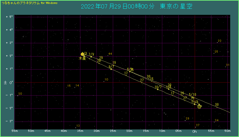 この後の木星は9月27日の衝を目指して地球へ近づきます。見える時間帯も次第に早くなり、観測条件が良くなります。
