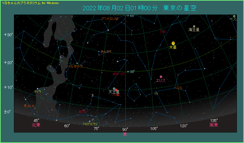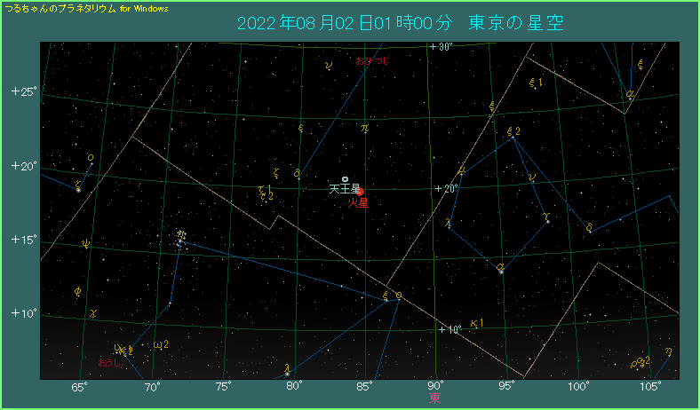 一方の天王星は、火星の左上です。間隔は1.3度と狭い方です。天王星の明るさは6等級ですから、双眼鏡なら簡単に見つけられそうです。しかし火星との光度差が大きいので、意外と見づらいかもしれません。天体望遠鏡ならと思いますが1.3度の視界を得るためには、低倍率で広視界なアイピースが必要です。