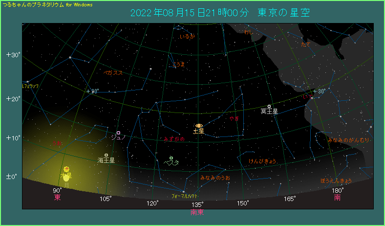 夜の21時ごろでしたら、土星は南東の空に見えます。落ち着いた黄土色をしていて0等級です。肉眼でもすぐにそれとわかりますが、天体望遠鏡をお持ちでしたら、ぜひ望遠鏡を向けてください。