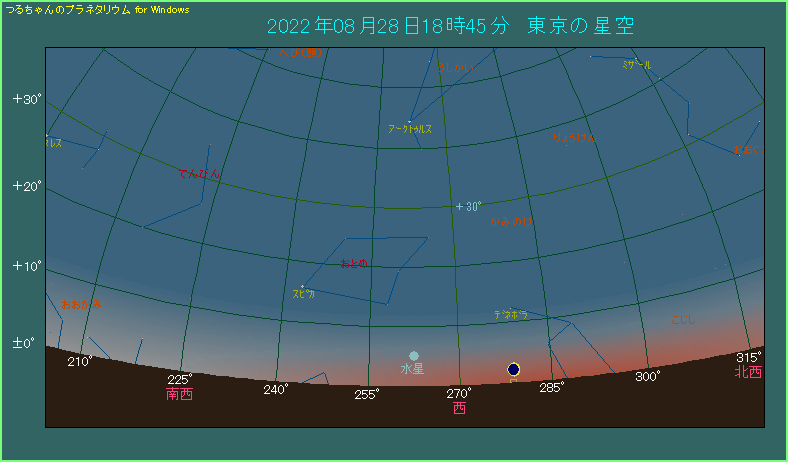日の入りから30分ほどたった西空のようすが、下の星図です。高度はわずか5.1度しかありません。薄暮の中で0.3等の水星を見つけるのは、かなり大変でしょう。