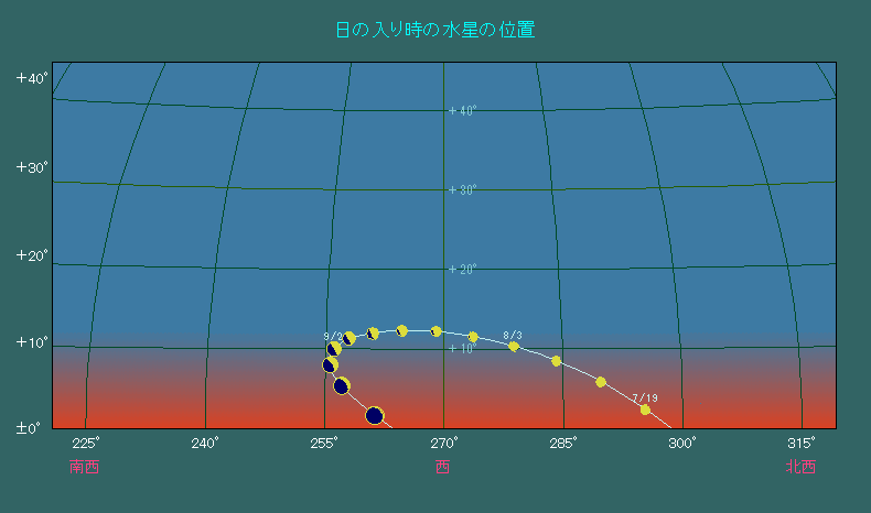 日の入り時刻に見える水星の位置(5日間隔) |