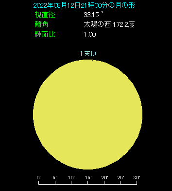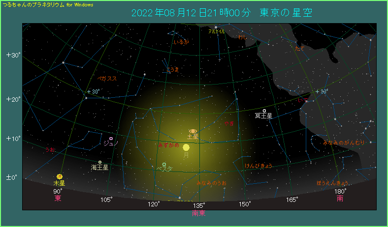 8月12日は月が土星に近づきます。 21時ごろ、南東の空をご覧ください。大きな月が見え、今日が満月です。月の上側からやや右側には0等級の星が見え、これが土星です。土星は3日後に衝を控えており、観測好機を迎えています。