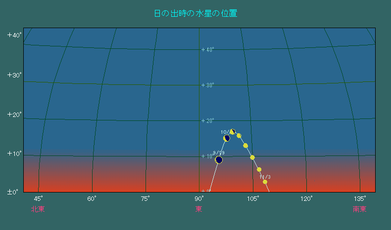 日の出時刻に見える水星の位置(5日間隔) |