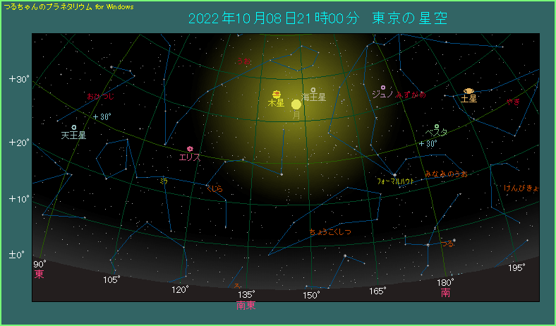 21時ごろに南東の空、空の中ほどをご覧ください。月齢12.6の月が見えます。木星はその左側にあり、-3.0等で金色に光ります。