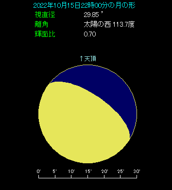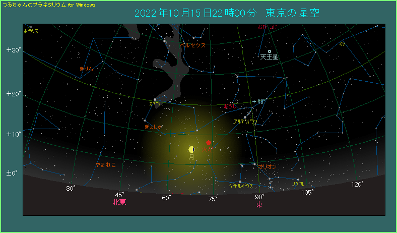22時ごろ東北東の方向を見ると、比較的低い位置に月齢19.6という丸みを帯びた月があります。月の右上には-0.9等まで明るくなってきた赤色の火星が見えます。しかし6.1度の間隔がありますので、それほど近い位置というわけではありません。