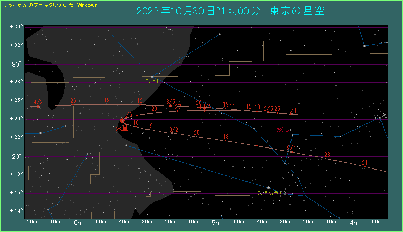 21時ごろ、東の方角を見ましょう。比較的低い位置に明るく光る赤い星があります。これが火星です。日ごとに明るさが増しており、今日の明るさは-1.2等です。近くにあるオレンジ色をした1等星のアルデバランや、0等星のカペラよりも明るくて、周囲の星と比べてひときわ明るく輝きます。