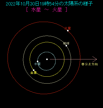 留とは地球から見た惑星が、いったん動きを止めることです。留の後の惑星は動く方向が変わります。火星の場合ですと、動きの速い地球が火星を追い越す時に見られる現象です。下の太陽系の図を見ると、地球が火星を追い越そうとしているところです。
