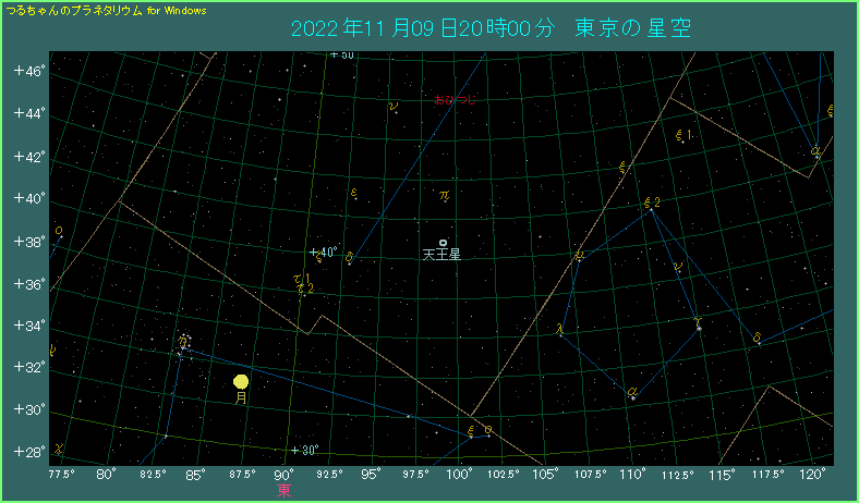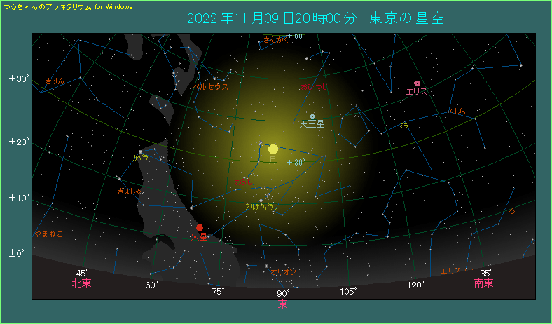 天王星は今、おひつじ座にあります。昨日は皆既月食中の天王星食が見られたということで、近くに満月過ぎの大きな月があります。月がまぶしくて観測条件としては最悪ですから、あと数日後に月が遠ざかった頃にご覧ください。