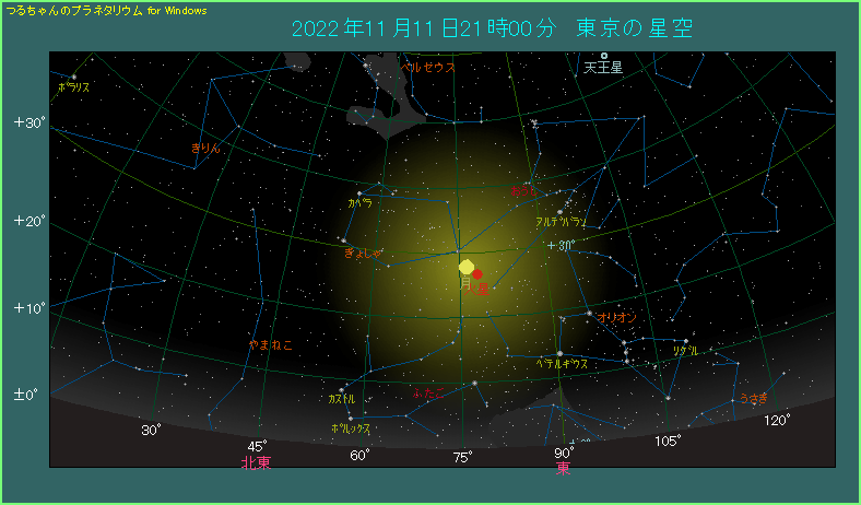 21時ごろ東の空に、3日前に皆既月食となった大きな月が見えます。右下に見える赤い星が火星で、-1.5等とかなり明るくなっています。月と火星の間隔は2度ちょうどで、良い条件の接近です。