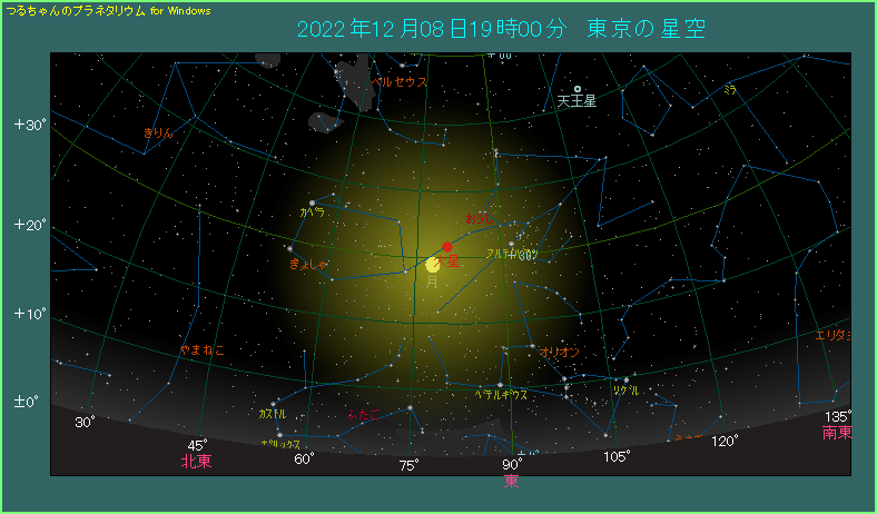 19時ごろ東の方角を見ると、大きな丸い月が見えます。それもそのはずで、今日は満月です。一方の火星は、月の右上へ3.7度離れたところにあります。今月1日に地球と最接近したばかりで、-1.9等で赤く輝きます。